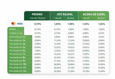 Comece vendendo com apenas 0,74% no débito e crédito à vista nos primeiros 30 dias ou R$ 5 mil vendidos.