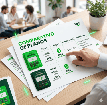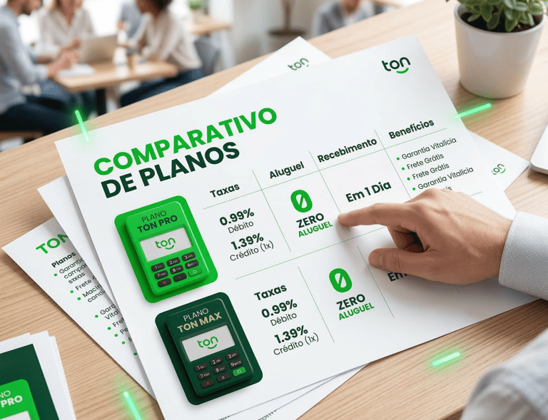 Na Ton, você não paga aluguel nunca. O que muda entre os planos é a taxa que você paga por cada venda e o valor inicial da maquininha. Escolher o plano certo é o que garante mais dinheiro no seu bolso no fim do mês.